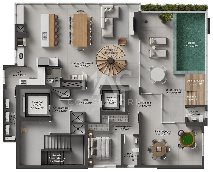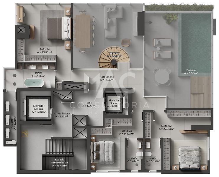 Cobertura duplex a menos de 200 metros da praia central de Balneário Camboriú / SC, com 4 suites, cozinha com área gourmet, piscina privativa e 03 vagas de garagem, condominio completo com 1.300,00m² de área de lazer.
